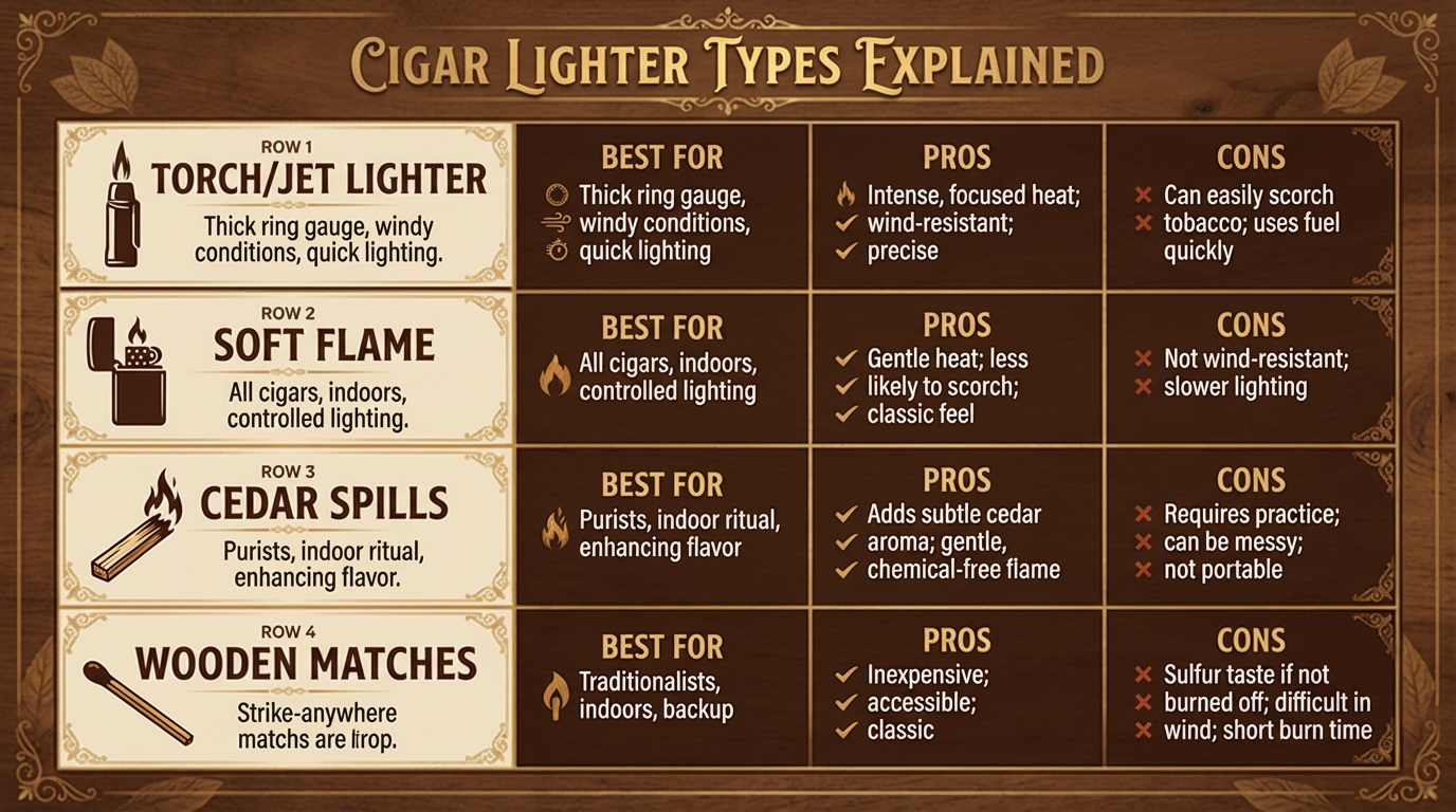 The first step in mastering the art of lighting a cigar is understanding the tools at your disposal. Each has its unique characteristics and is suited for different situations and preferences.